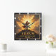 This powerful and moving design captures the theme of Jesus as the Light of the World. The artwork, featured on a square wall clock, displays the figure of Christ standing triumphantly on a rocky mountain summit, overlooking the world below. He is dressed in flowing red and white robes and has his arms spread wide in a gesture of divine blessing. The scene is illuminated by an intense golden sunburst from behind, breaking through dramatic clouds. The title "LIGHT OF THE WORLD" and the bold name "JESUS" reinforce the image. The core message of Christian faith is quoted from John 8:12: "I am the light of the world." This incredible image provides a spectacular visual representation of faith, serving as an inspiring timepiece and striking centerpiece for any faithful home or sacred space.