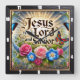 Este vibrante relógio quadrado mostra o texto radiante "Jesus é meu Senhor e Salvador" iluminado por uma explosão de luz divina. Está cercado por um belo arranjo de flores cor-de-rosa e azuis, com borboletas elegantes fluindo por aí. Esta obra de arte espiritual cria uma atmosfera erguida e serena para qualquer casa.