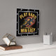 Este relógio de parede preta apresenta o texto "REPRODUZIR DURO" em uma fonte amarela em negrito, arquivada no topo, e "WIN EASY" em uma fonte vermelha em negrito, arquivada no fundo. No centro está um gráfico dinâmico de um corredor, que parece ser um indivíduo de pele clara, em cheio estriado com linhas de velocidade amarela e vermelha sugerindo movimento. O design é motivacional e orientado para o esporte.