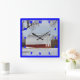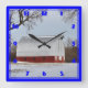 Uma fotografia de um Barn Vermelho do Kansas que é brilhante e colorido com árvore, céu azul e neve. Este é o norte brilhante e colorido de Hutchinson Kansas Kansas USA fora do país. Isso é num relógio de parede quadrado.