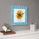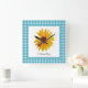Um relógio quadrado de gingham azul bonito com um girassol amarelo brilhante e alegre, com uma pequena joaninha vermelha, sentada nas pétalas. Esse design de estilo country certamente o coloca em um bom humor de piquenique no verão!