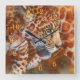 Perto de um Leopardo macho que tem cores e padrões fantásticos para se misturar ao seu colorido mundo da selva sem parar. Este é um tributo artístico à misteriosa evolução genética, e à terra onde as lendas são cultivadas, então esta criatura inspiradora vagueia. Paleta de cores de coral, laranja e dourado.