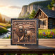 This dramatic square wall clock features a highly dimensional, close-up illustration of a brown lion with an expressive face and a striped zebra standing closely together. The entire design is rendered in muted brown, tan, and dark leather-like tones, strongly suggesting a deep sculpted relief or Sculpted Leather Look. The lion has a textured mane and is positioned on the left, while the zebra is on the right, appearing happy with prominent stripes. They are framed by a prominent, circular border of gnarled, dark tree roots and stylized leaves carved into the perimeter. The background is a dark, heavily textured leather panel. The large, three-dimensional embossed text "BESTIES FOR LIFE" is carved across the top center in a bold, golden serif font. The clock face features a simple clock face border with large, white, numbered tick marks (1 to 12) integrated into the outer frame. The artwork is surrounded by a thick, dark brown decorative border that resembles a black wood frame.