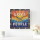 This image showcases a vibrant and inspiring artwork. The artwork features the text "LOVE GOD LOVE PEOPLE" in bold, colorful letters against a dynamic background. The top half of the background radiates with warm hues of yellow, orange, and red, resembling a sunburst, while the bottom half transitions into cooler tones of blue, evoking a sense of water or sky. The use of bright colors and dynamic brush strokes creates an uplifting and motivational visual effect.