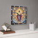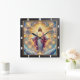 Este relógio de parede quadrado apresenta uma imagem luminosa de Jesus Cristo com um Coração Sagrado radiante, envolto em um halo de luz ouro e padrões intrincados. Ele se posiciona entre nuvens macios com braços estendidos, cercado por um brilho etéreo e órbitas celestes, criando uma profunda e inspiradora obra religiosa.