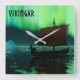 Uma imagem ligeiramente estilizada de um navio de longa distância Viking navegando à noite sob as Luzes do Norte ali um casal de icebergs; a maioria da tripulação está dormindo. A leitura de texto "VIKINGAR" (Vikings) também é exibida.