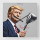 A imagem mostra Donald Trump, segurando um clube de golfe, com o texto "Forte mais anos de grandeza!" em letras negrito. É um tom de língua na bochecha para o seu amor pelo golfe e para concorrer à presidência em 2024.