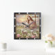 Este relógio de sereno quadrado retrata a Virgem Maria segurando a criança Jesus, cercada por cordeiros gentis em um lugar de campo pacífico. Uma igreja e um crucifixo são visíveis à distância, completando esta cena tenra e espiritual, simbolizando o amor divino e a inocência.