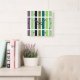 Padrão geométrico linear, retangular, listrado de matizes pretas, roxas e verdes.