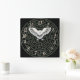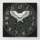 Este relógio da parede de arte fantasiosa apresenta um rosto de 13 horas e um labirinto verde de cobertura comumente chamado labirinto, acentuado por uma coruja branca em voo de cheio.