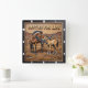 This appealing square wall clock features a highly dimensional illustration of a mother horse and her foal standing together in a grassy pasture. The artwork is rendered in warm brown and tan tones, strongly suggesting a deep carved relief or Engraved Wood Look. The horses have textured fur and are positioned against a backdrop of rolling hills and a wooden fence line. The foreground features detailed tall grass and brush, emphasizing the farm or ranch setting. The carving style gives the entire image a strong three-dimensional, sculpted quality. The large, three-dimensional embossed text "BESTIES FOR LIFE" is carved across the top. The clock face features a simple clock face border with large, white, numbered tick marks (1 to 12) integrated into the outer frame. The artwork is surrounded by a thick, dark brown decorative border that resembles a black wood frame.