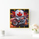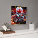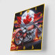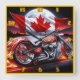 Uma motocicleta em greve, enfeitada com chamas, coloca-se contra o pano de fundo da bandeira canadiana, iluminada por uma lua de cheio brilhante e águas refletoras.