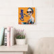 Design personalizável de uma mulher com óculos escuros e uma roupa com padrão geométrico em tons azuis e laranja impressionantes. Um design moderno e sofisticado perfeito para amantes da moda.