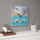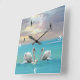 Em destaque está uma família branca de cisnes com cisnes voadoras em um bonito cenário litoral.