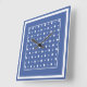 Um relógio de parede muito na moda quadrado, em azul escuro na moda (Mônaco) com bolinhas e listras brancas.