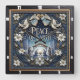 This square wall clock features a highly detailed, dimensional illustration of the Nativity scene centered within an elaborate border. The central motif, set against a dark blue background, shows Mary, Joseph, and the Baby Jesus in the manger, surrounded by other figures. Above them, the text "PEACE ON EARTH" is prominently displayed, flanked by two angels and two white doves. The entire circular scene is framed by a rich blue and gray floral wreath of white lilies and blue berries. The illustration is set within a wide, dark outer wood-look frame, which is simulated using high-detail artwork and is not real wood.