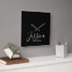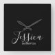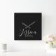 Relógio personalizado moderno, minimalista e elegante com seu primeiro e sobrenomes em um roteiro branco sobre fundo preto. Este relógio fará a adição perfeita ao seu escritório.