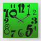 Um relógio de na moda com números negros divertidos e engraçados, em diferentes tamanhos e estilos em um simples, moderno, gradiente de verde sombreado, fundo