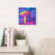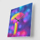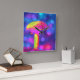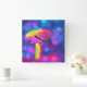 O néon coloriu o cogumelo psicadélico em cor-de-rosa e em amarelo contra um azul brilhante e um fundo sparkling roxo do bokeh