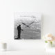 Personalize ou remova facilmente o texto deste relógio de parede que apresenta uma imagem a preto e branco de um pescador solitário que se encontra numa borda rochosa no lago Seneca, em Genebra, Nova Iorque. O texto, do autor transcendentalista, naturalista e filósofo, Henry David Thoreau, diz: "O tempo está além do riacho onde eu vou pescar. Ela é tirada do famoso livro de Thoreau, Walden, que ele escreveu em Concord, Massachusetts sobre sua vida na floresta ao redor de Walden Pond. Foi publicado em 1854.