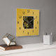 Feche a foto de um belo rosto de gato. O olhar está hipnotizando. Você mal pode parar de olhar para trás! Números pretos. Quadro de ouro quadrado. Este relógio também existe em outras versões coloridas.