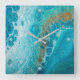 10,75" x 10,75" de relógio de parede acrílica com uma imagem de aqua, azul e marrom de arte fluida parecendo uma onda intermitente. As turquesas marcam as 12, 3, 6 e 9 posições. Veja toda a coleção de trava marítima do DÉCOR | Seção Relógios.