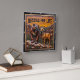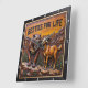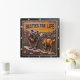 This highly dimensional square wall clock features a bold, close-up illustration of a brown panther (or leopard) and a white, happy goat standing side-by-side. The entire design is rendered in muted brown, tan, and dark leather-like tones, strongly suggesting a deep sculpted relief or Sculpted Leather Look. The panther has textured fur with clear spots and is positioned on the left, while the goat is on the right, smiling with large curved horns. They are surrounded by an elaborate wreath of gnarled, dark branches and leaves carved into the perimeter. The background is a dark leather panel with deep texture. The large, three-dimensional embossed text "BESTIES FOR LIFE" is carved across the top center in a bold, golden serif font. The clock face features a simple clock face border with large, white, numbered tick marks (1 to 12) integrated into the outer frame. The artwork is surrounded by a thick, dark brown decorative border that resembles a black wood frame.