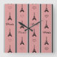 Ilustração Paris com Torre Eiffel e decoração cardíaca e design de texto de Paris sobre fundo listrado preto, branco e rosa