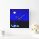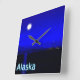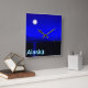 Moonrise na passagem de Dentro do casaco do Alasca. Montanhas à distância e um barco de pesca dirige-se para norte. A leitura de texto "Alaska" aparece em azul e branco brilhantes.