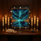 Uma ilustração impressionante retrata uma pessoa pescando de um barco em um lago sob um céu vivo com um ataque de raios massivos. A design é caracterizada por suas cores elétricas, vibrantes e um poderoso sentido de energia. O reflexo do relâmpago sobre a água e os peixes brilhantes aumenta o efeito dramático.