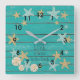 Personalize sua casa de decoração costeira ou casa de férias com esse relógio de parede temático da praia. Sua escolha de redondo ou quadrado. Impresso com um padrão de pranchas de madeira rústicas em sotaques azul-turquesa e de peixe-estrela. Edite o texto se desejar. Veja muitos outros itens de coordenação nesta coleção "Beach Stripes and Starfish" no Camp_and_Cottage no Zazzle.