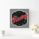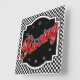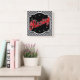 Um presente de excelente para qualquer entusiasta de corridas ou uma fantástica adição ao seu barroom, clubroom ou gameroom, nosso design de relógio quadrado apresenta um padrão de verificação preto e branco com a palavra "Corrida" na diagonal em um símbolo vermelho, preto e branco em um emblema personalizado preto e branco. O relógio é desligado com algarismos brancos.