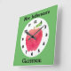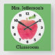 Professor Watercolor Red Apple Personalized Green Classroom Clock. Fundo verde com fonte preta personalizando este relógio de sala de escola divertido. Maçã silhueta de cor vermelha com folha verde e caule. Presente de professor de Excelente, relógio de parede para a sala de aula na escola. Fácil de ler os números do relógio preto.