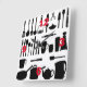 Pulso de disparo de parede inspirado retro à moda da cozinha, com os gráficos pretos do estilo da silhueta de utensílios da cozinha e de números vermelhos. Personalize com seu próprio texto ou saa como é.