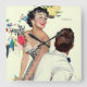 Artista:Joe DeMers | Mulher de vestido listrado em zebra e alfinete de flor vermelha que se debruça sobre uma cadeira que fala com um homem de fato branco