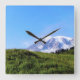 Uma vista do Monte Rainier e ao redor de colinas verdes rolantes em um dia ensolarado de Primavera.