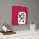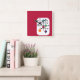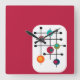 Este relógio de parede tem um design moderno do século médio de um retângulo magenta com um retângulo branco no fundo com uma grade preta com círculos retrorreflectores sobre ele.