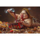 Retrato Colorido "Rainha da Decadência Glutônica". Um retrato obscuro e grotesco simbolizando as consequências da indulgência sem controlo. Este trabalho de arte surreal retrata uma mulher que se transforma crescentemente numa larva de bruxaria em meio a uma montanha de doces e vinhos, incorporando os excessos da cultura de consumo e do abandono pessoal.