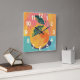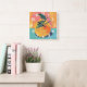 Esta imagem vibrante apresenta uma cor de laranja estilizada e colorida com folhas verdes, colocada sobre um fundo rosa vivo e laranja. O trabalho de arte tem um toque de arte pop moderna e lúgubre.