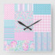 Relógio Quadrado Rosas Rosa, Borboletas Faux Patchwork Clock
