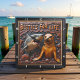 This dramatic square wall clock features a highly dimensional, close-up illustration of a gray shark with sharp teeth and a large, smiling orange-brown seal swimming together. The entire design is rendered in muted brown, gray, and dark blue tones, suggesting a deep carved relief or Engraved Wood Look, resembling aquatic rock formations. The shark is partially concealed behind the seal and features detailed gills. The seal appears cheerful, positioned in the right foreground. The background is a dark, textured field filled with stylized coral and bubbly rock shapes. The large, three-dimensional embossed text "BESTIES FOR LIFE" is carved across the top center. The clock face features a simple clock face border with large, white, numbered tick marks (1 to 12) integrated into the outer frame. The artwork is surrounded by a thick, dark brown decorative border that resembles a black wood frame.