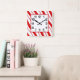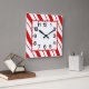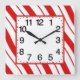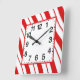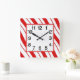 relógio de parede acrílico de 10,75" x 10,75" com uma imagem de listras de menta vermelha e branca. Rosto de relógio fácil de ler em branco com borda vermelha. Veja toda a coleção de Relógios de Natal na categoria HOME na seção HOLIDAYS.