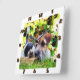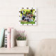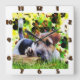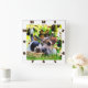Um Terrier Puppy preto e branco no chão atrás de um tronco. Com uma pata no tronco e as vinhas verdes caem atrás dele. Nesta pintura de óleo neste relógio de parede
