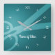Um relógio de parede ciano escuro com um par de tesouras, algarismos brancos romanos e a opção de adicionar o seu nome ou o nome da sua empresa.