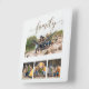 Relógio de fotos da família 4 com uma fonte engraçada e branca de script que diz, "família". Adicione suas fotos favoritas a este relógio para fazer uma bela manutenção que será preciosa nos próximos anos.