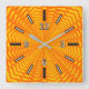 Este design de relógio quadrado vibrante, que olha apresenta um padrão cor de laranja e abstrato amarelo, semelhante ao sol. Também apresenta retângulos que marcam as horas e números que indicam as horas "12", "3", "6" e "9".