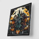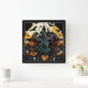 Três espantalhos brancos com chapéus coloridos e abóboras esculpidas ficam contra um pano de fundo assombroso de morcegos e um castelo, capturando a essência da noite de Halloween.
