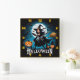 Uma bruxa brincalhona sua vassoura, cercada por morcegos e abóboras, enquanto a lua de cheio lança um brilho mágico sobre a paisagem encantada.