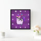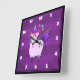 Um relógio com um desenho caprichoso de um unicórnio rosa legal e engraçado que tem um homem roxo e um conto. Esta criatura fofinha está vestindo óculos de sol em forma de coração e é decorada com pequenas estrelas e um coração. Fundo listrado roxo.