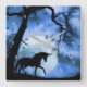 Um relógio de fantasia com um unicórnio e lua. O unicórnio é emoldurado por um carvalho com estrelas bonito.